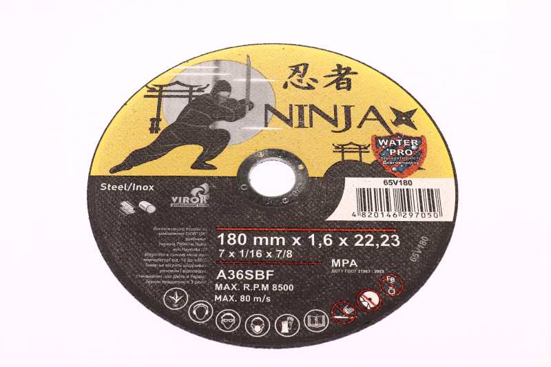 Відрізний диск по металу та нержавіючій сталі Ninja (TM) з діаметром 180 мм, отвором 22.23 мм та товщиною 1.6 мм (ВІРОК) призначений для точного та швидкого різання. Ідеальний вибір для професійних та домашніх робіт з металом.